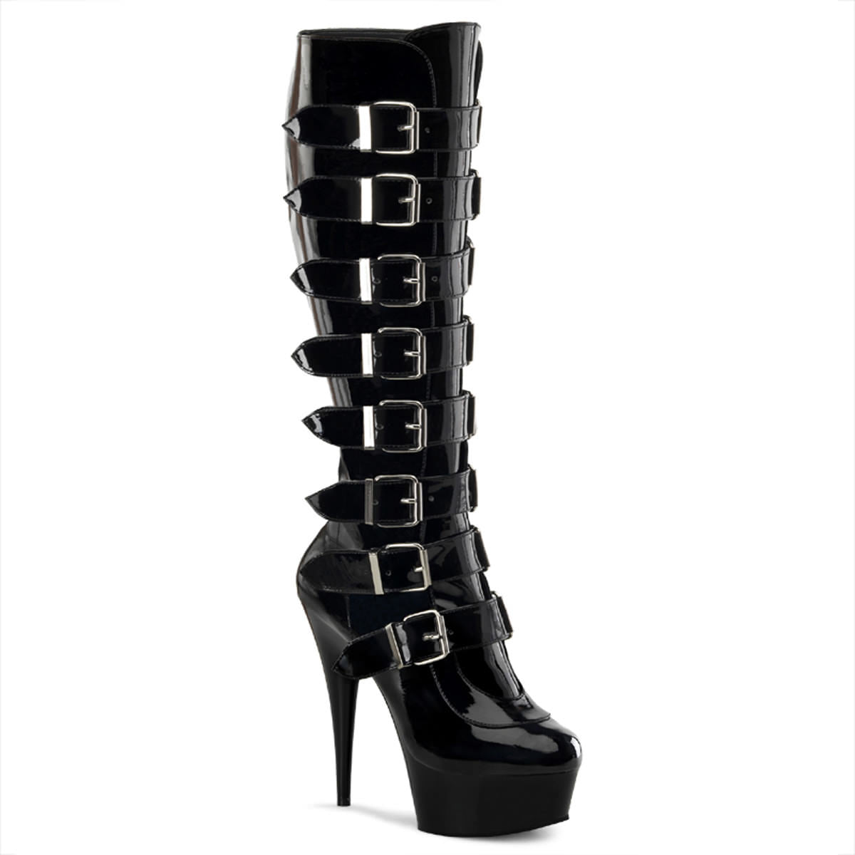 This knee boot features a 6" (15.2cm) stiletto heel, a 1 3/4" (4.5cm) platform, buckles that go up to the knee, and a full inner side zip closure.de zip closure.